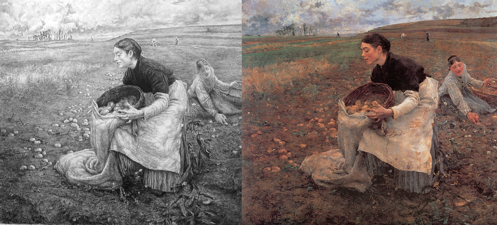 Gravure de Louis Monziès d'après "Saison d'Octobre: Recolte des pommes de terre" de Jules Bastien-Lepage conservé au National Gallery of Victoria (Melbourne, Australie - Aubrun 217)