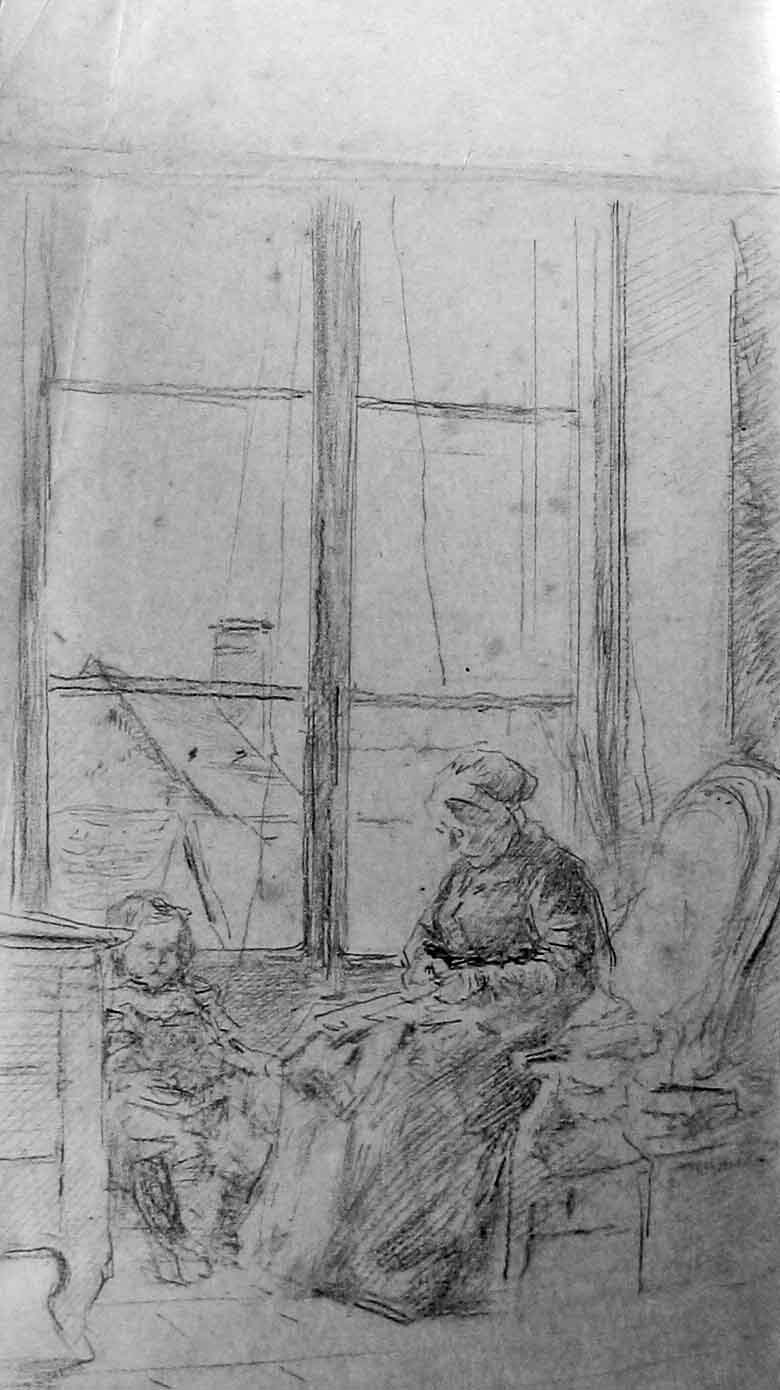 Femme avec une fille devant la fenêtre, Dessin de Louis Monziès, Collection particulière