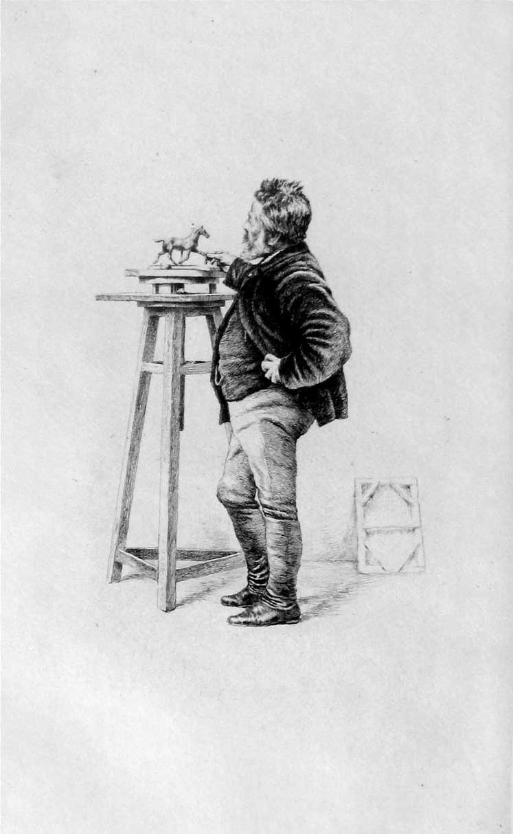 Meissonier modelant une maquette en cire d'après une photo par Bingham (http://gallica.bnf.fr/ark:/12148/btv1b8432930r/f15.item),