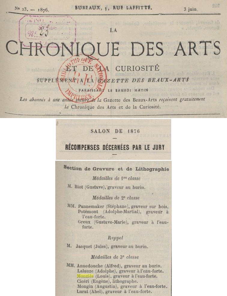 Médaille de 3e classe obtenue au salon de 1876 Chronique des Arts de 1876 Source : BNF - Chronique des Arts