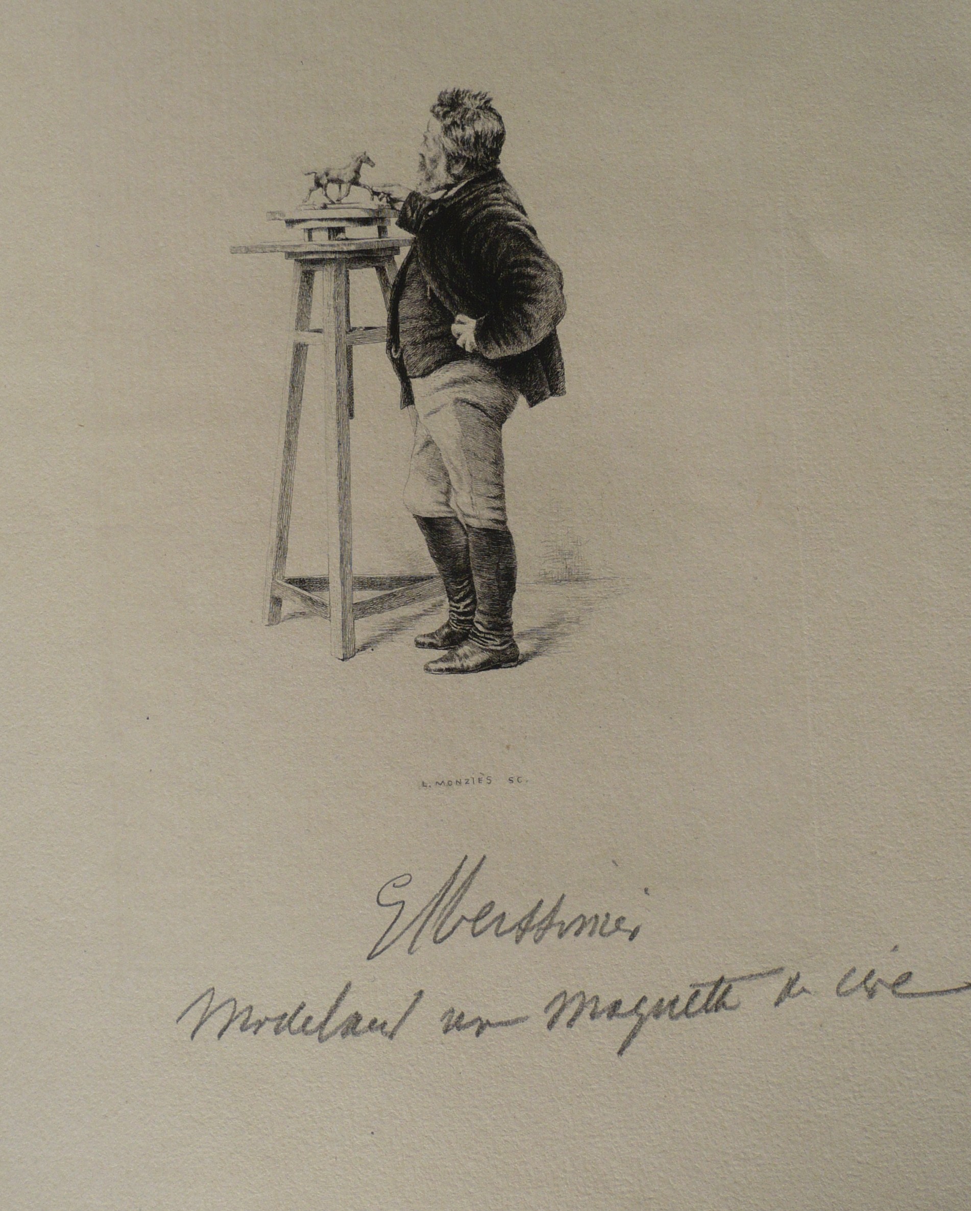 Meissonier modelant une maquette en cire d'après une photo par Bingham (http://gallica.bnf.fr/ark:/12148/btv1b8432930r/f15.item),