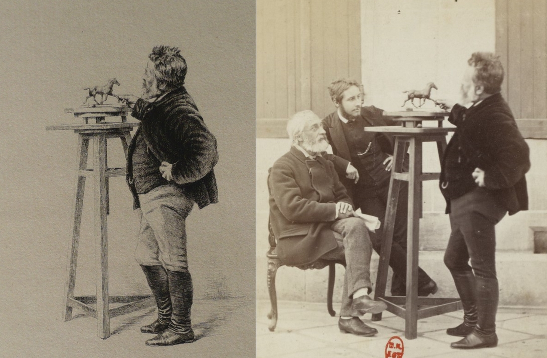 Meissonier modelant une maquette en cire d'après une photo par Bingham (http://gallica.bnf.fr/ark:/12148/btv1b8432930r/f15.item),
